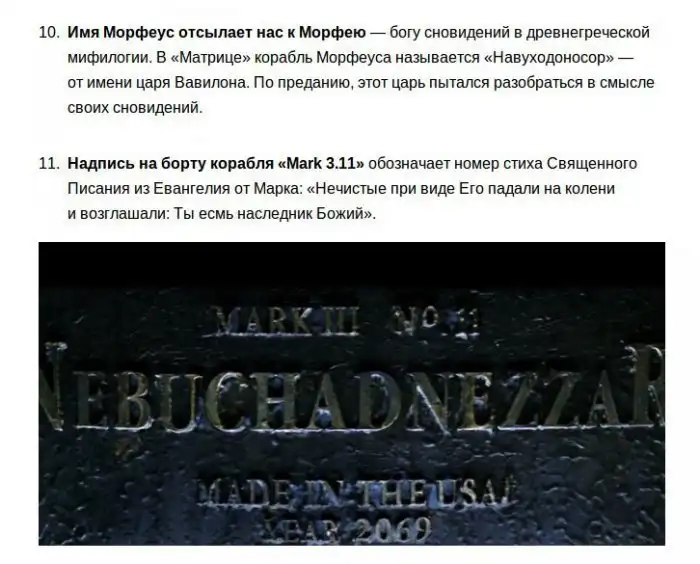 Добавьте еще инфу про имена, а то маловато. Сайфер - укороченный вариант Люцифера (и при этом фамилия его Рейган), что нехилая такая аллюзия на Рональда Рейгана, который сперва был актером, потом другой "знаменитостью", а позже потерял память из-за болезни Альцгеймера. Так что те, кто хорошо помнят соответствующую сцену в фильме, пожалуй, посмеются. Имя главного героя Томас Андерсон. Томас - это Фома (добавьте "неверующий" и поймете, насколько подходит имя этому персонажу), а вот Андерсон в дословном переводе "сын человеческий".