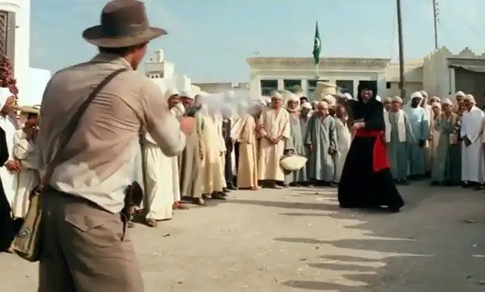 Сцена, где Индиана Джонс встречает человека, вооруженного мечом, должна была закончиться интенсивной битвой. Однако актер Харрисон Форд заболел пищевым отравлением и не имел сил драться, поэтому режиссер внес небольшое изменение — вместо дуэли Индиана вытаскивает револьвер и стреляет в злодея. Сцена стала одним из самых знаковых моментов в истории кино.