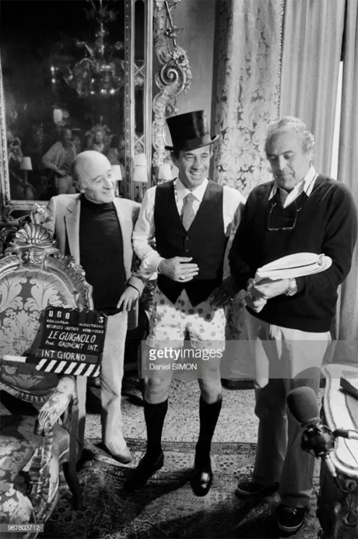 Жорж Лотнер, Жан-Поль Бельмондо и Мишель Одиар во время съемок фильма "Игра в четыре руки" 22 октября 1979 года в Венеции