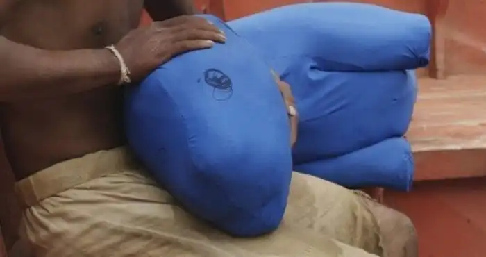 Джон Розенгрэнт, художник по спецэффектам, примеряет часть костюма динозавра для «Парка Юрского периода 3».