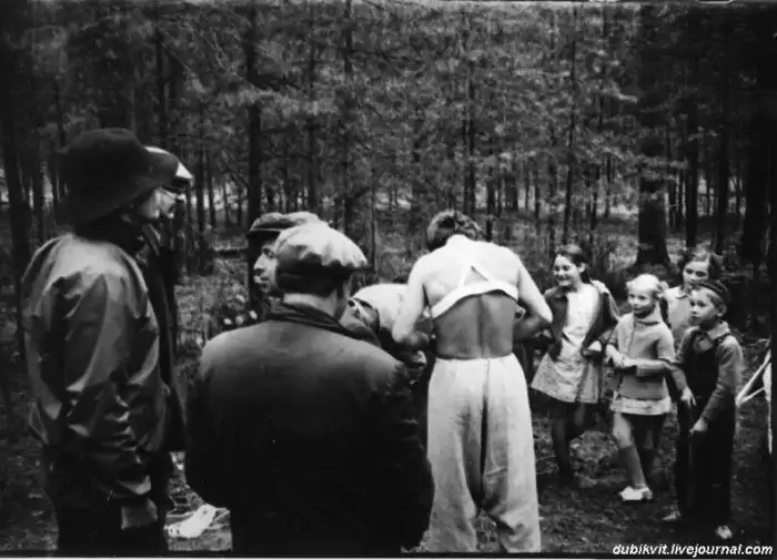Слева Андрон Кончаловский наблюдает ,как готовятся каскадёры прыгать с макушки сосны на сосну