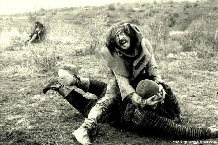 Станислав Говорухин, Владимир Конкин и Владимир Высоцкий на съёмках «Место встречи изменить нельзя», 1979 год