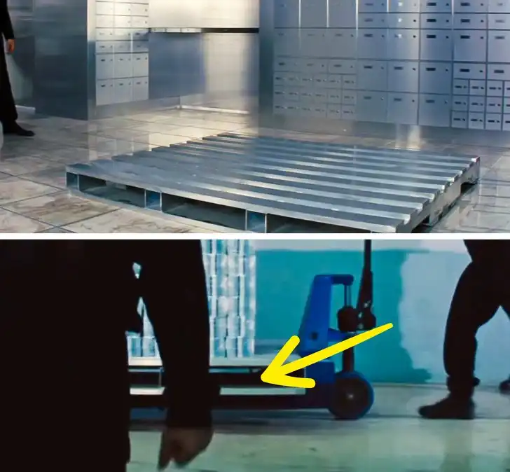 - По сюжету герои фильма «Иллюзия обмана», Дэнни и Хенли, попадают в хранилище, спрятавшись в металлическом поддоне. Но они не только физически там не поместились бы — на этих кадрах мы видим, что в поддоне никого нет.