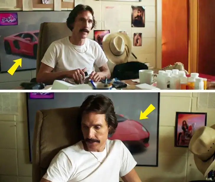 - А вот и еще один анахронизм. В офисе главного героя фильма «Далласский клуб покупателей» на стене висит постер с Lamborghini Aventador. Действие фильма происходит в 1985 году, однако эту модель автомобиля начали выпускать только в 2011-м.
