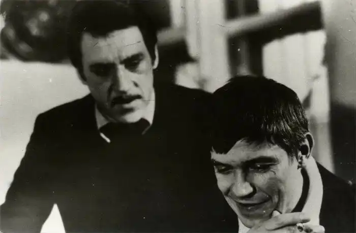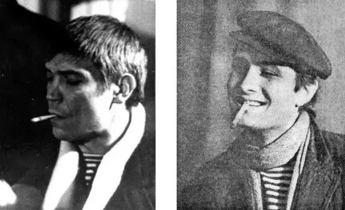 Владимир Высоцкий в роли Жеглова и Иван Бортник в роли Векшина. Вообще, Высоцкий хотел, чтобы Бортника взяли на роль Шарапова. И эти снимки в сети так и публикуют, как пробы на роли Жеглова и Шарапова (в том числе и в моём журнале). Но изучив внимательно другие пробы, можно убедиться, что у Бортника здесь именно роль Векшина. Вот, сравните с пробой Градова именно на роль Васи Векшина