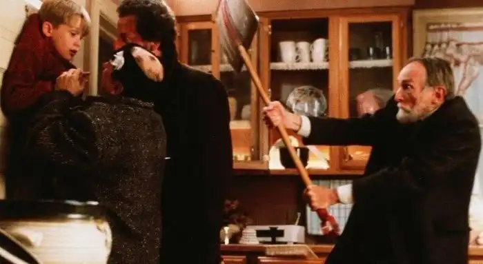 Ближе к концу фильма, где бандитам наконец удается поймать Кевина (Маколей Калкин), они вешают его на крючек и один из них (Джо Пеши) говорит мальчику, что откусит ему все по очереди. Во время репетиции этой сцены, Джо немного перестарался и на самом деле укусил Маколея так, что у того пошла кровь. А шрам на пальце остался по сей день.