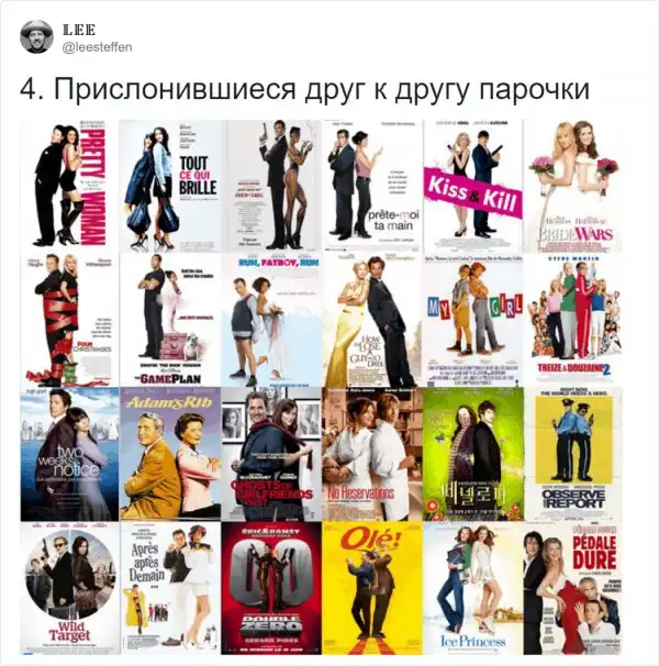 Пользователь Твиттера с ником "leesteffen" заметил странную тенденцию в индустрии киноплакатов. Он составил коллажи и убедился в том, что фильмы можно разделить на типы по их постерам. Давайте посмотрим, что у него получилось.