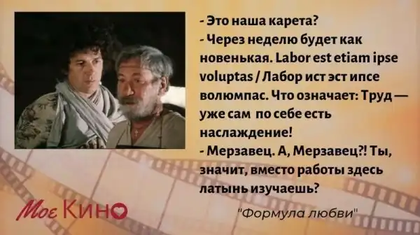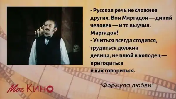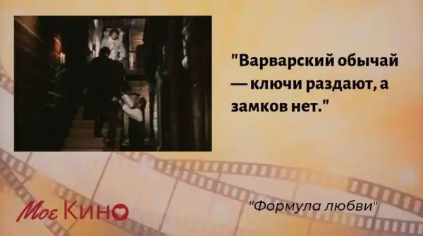 Есть фильмы, которые можно пересматривать бесконечно. К таким относится и комедия Марка Захарова "Формула любви". Это не просто фильм, где можно выделить несколько интересных цитат. Это фильм - одна большая цитата. Каждое слово, каждая фраза, произнесённая в этом фильме запоминается легко. И конечно, все реплики героев зрители моментально разобрали на цитаты.