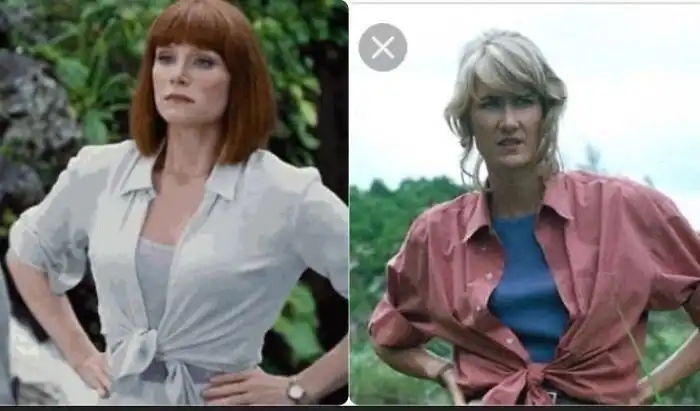 Брюс Даллас Ховард в "Мире Юрского периода" и Лора Дерн в "Парке Юрского периода" одинаковым образом носят рубашку поверх футболки, связав ее узлом.