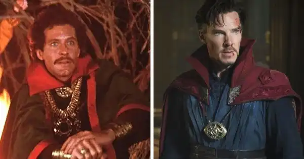 Питер Хутен в фильме «Доктор Стрэндж» (1978) и Бенедикт Камбербэтч в фильме «Мстители: Финал» (2019).
