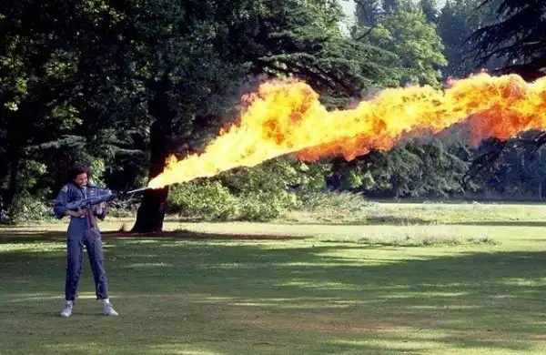 Сигурни Уивер тестирует огнемёт для «Чужого»