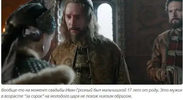 С другой стороны – Маковецкий – да, играет нормально. А второй исполнитель роли Грозного – Александр Яценко мне не понравился. Авторы сериала похоже так и не поняли одной простой вещи – Грозному в 1547 году было 17 лет. СЕМНАДЦАТЬ. Да, тогда взрослели раньше. Но у 43-летнего мужика сыграть 17-летнего царя не получилось вообще. Совсем. Может быть, если бы ему доверили играть Грозного в то время, когда он создал опричнину – еще бы что-то и получилось. А так получилась фигня. Царь в то время, когда женился на Анастасии Романовой, был молод!!!