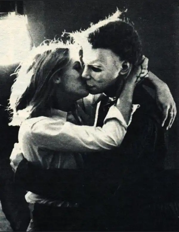 Джейми Ли Кёртис целует Майкла Майерса на съемках "Хэллоуина", 1978 год