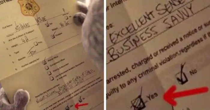14. В «Зверополисе» (2016) Ник сначала ставит галку на «Да» в графе, был ли он ранее арестован, но затем зачёркивает отметку и исправляет на «Нет»
