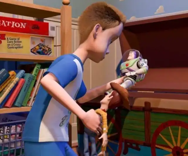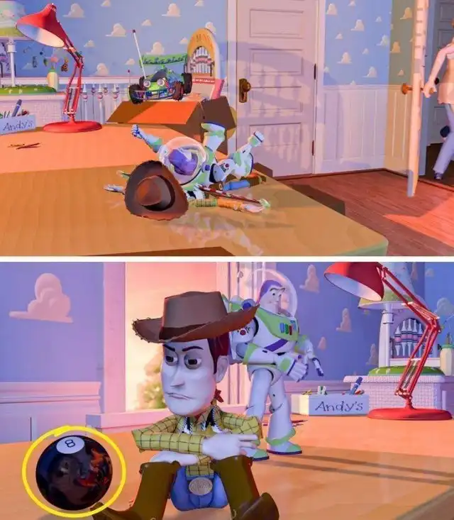 В первой части «Истории игрушек» есть сцена, в которой Энди уходит в пиццерию и оставляет Базза и Вуди дома на столе. В этот момент видно, что рядом с ними ничего нет и стол практически пустой. Однако уже в следующей сцене рядом с нашим любимым ковбоем появляется шар предсказаний.