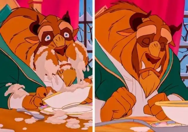 В том же мультфильме есть сцена, где Чудовище и Белль завтракают, и Чудовище весь перемазывается кашей. Но уже на следующем его лицо снова чистое, как будто ничего и не было – а затем каша появляется снова.