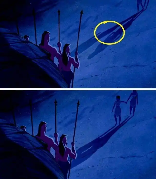 В мультфильме «Покахонтас» главная героиня идет навестить своего возлюбленного, которого держат в плену, вместе со своей подругой. Они держатся за руки, но если обратить внимание на их тени, то видно, что их руки не касаются.