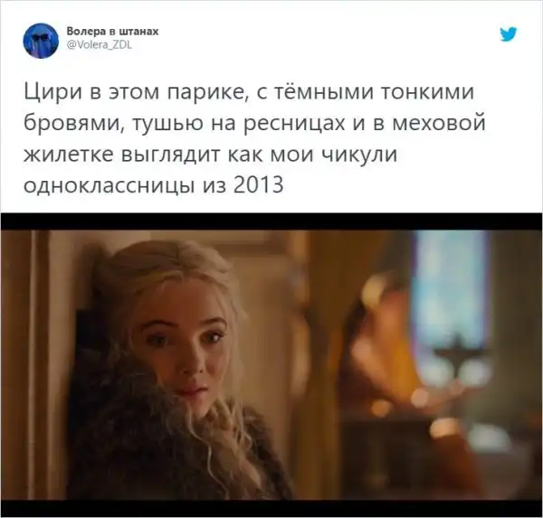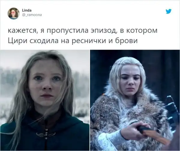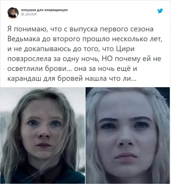 На прошлой неделе состоялась премьера 2 сезона сериала "Ведьмак". В наших краях поклонники произведений Анджея Сапковского сериал восприняли очень неоднозначно. Но несмотря на это, в Рунете пристально следят за развитием событий в сериале. И на этот раз больше всего народ удивила внешность Цири, которую сыграла Фрейя Аллан. Само собой в Твиттере без юмора не обошлось.