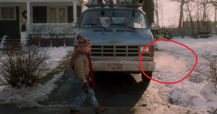 В фильме есть одна малозаметная, но очень интересная деталь, когда Кевина чуть не сбивает фургон грабителей. Если присмотреться, то можно заметить, что дым из выхлопной трубы засасывает обратно в машину. Всё потому, что сцена снималась реверсом. На самом деле Калкин шел задом наперед.