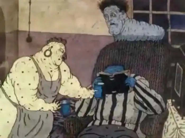 «Его жена курица» вызывает вопросы одним только названием. Что уж говорить о картинке с сине-неживыми персонажами в декорациях повседневности советской квартиры. Здесь в пору только взрослым искать метафоричные смыслы.