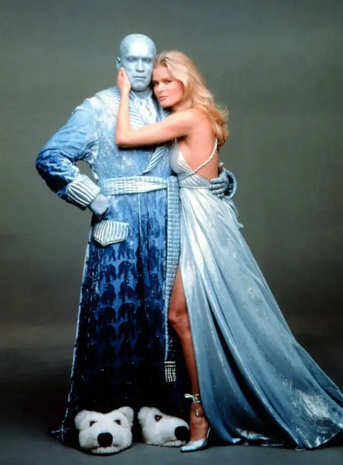 Бонусом показываем вам не постер, а промо-фото к фильму «Бэтмен и Робин», на котором мы видим главного злодея Мистера Фриза в компании его жены, которая не появляется в фильме, и по словам самого Фриза находится в коме. Видимо, изначально создатели супергеройского фильма хотели включить её в сюжет, но передумали. Зато теперь мы знаем, что персонаж Арнольда Шварценеггера нам не врал.