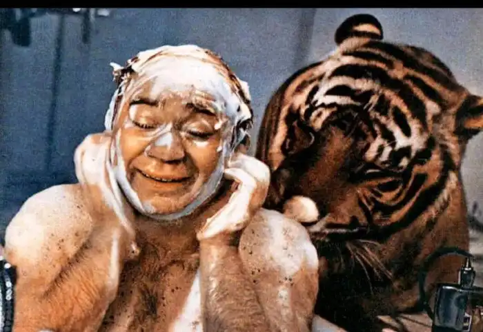 Также для съемок сцены в клетке, чтобы тигры интересовались происходящем в самой клетке, туда подложили поросенка, которого Леонов должен был тыкать вилкой. Когда все тигры собрались вокруг клетки и сцену отсняли, режиссерам пришлось стрелять в воздух, чтобы распугать тигров и дать возможность Леонову выйти. Так, одно испуганное животное вовсе убежало в море, и его пришлось спасать.