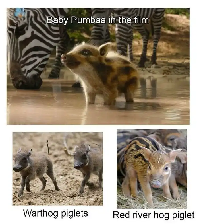 6. В "Короле Льве" (2019) маленький Пумба (верхнее фото) совсем не похож на поросенка-бородавочника (снизу слева) и больше напоминает детеныша речной свиньи (снизу справа)