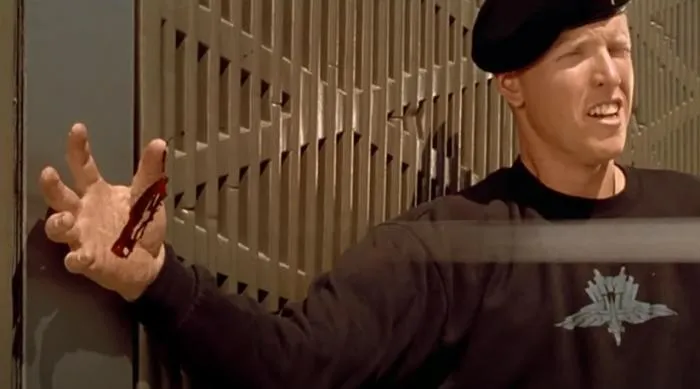 7. Небольшая придирка. Во время просмотра этого незаметно, но при медленном просмотре можно увидеть, что кровь из ладони начинает идти еще до того, как сержан кинул в нее свой нож. Зато можно заметить, что рука у новобранца явно бутафорская.
