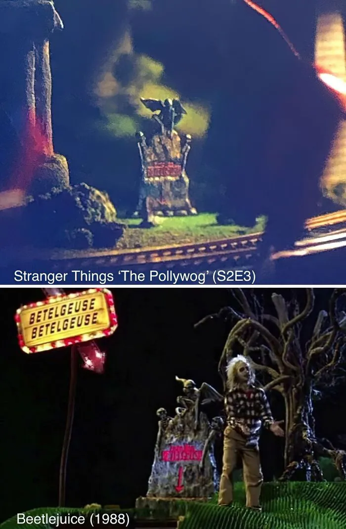 10. В 3 эпизоде второго сезона сериала «Очень странные дела», если присмотреться к модели города мистера Кларка, можно увидеть надгробие Бетельгейзе из «Битлджуса» (1988)