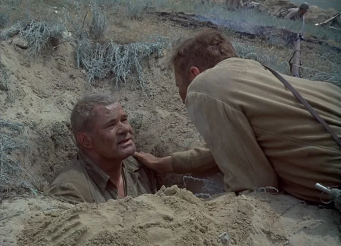 Фильм к юбилею Победы на экраны не вышел - посодействовал тогдашний министр обороны СССР Гречко: и одеты бойцы не так - слишком оборванные, и спичкой подошвы прибивают, и голодные, и все время отступают...