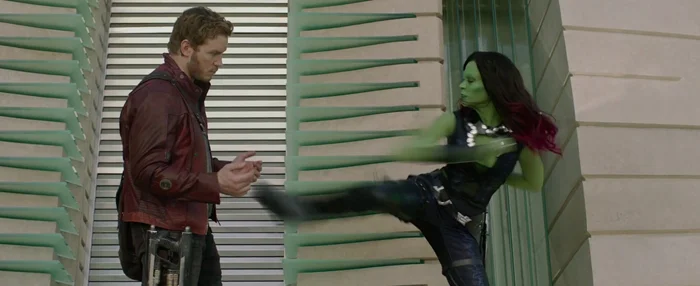 Зои Салдана чуть не сломала Крису Пратту ребра во время съёмок сцены драки. Во время тренировок Пратт и Салдана надевали защитную экипировку, чтобы они могли на самом деле ударить друг друга. Однако, когда наступил день съемок сцены, Пратт забыл надеть защитную экипировку и не сказал Салдане, потому что думал, что она сдержится, если узнает.