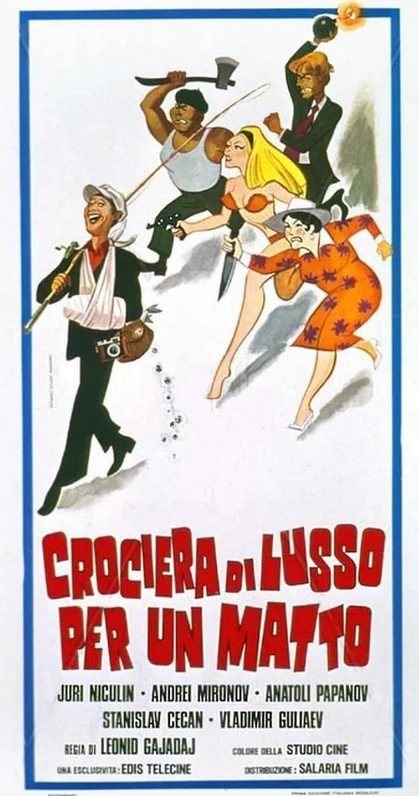 А это афиша многим известна. Я как-то использовал ее фрагмент для теста. Если бы я не знал, что это советский фильм, то я бы подумал, что это итальянская комедия 50-х или 60-х годов. Но оно и понятно - афиша создана для итальянских зрителей. Что характерно - все персонажи легко узнаются, хотя похожесть лишь чисто символическая.