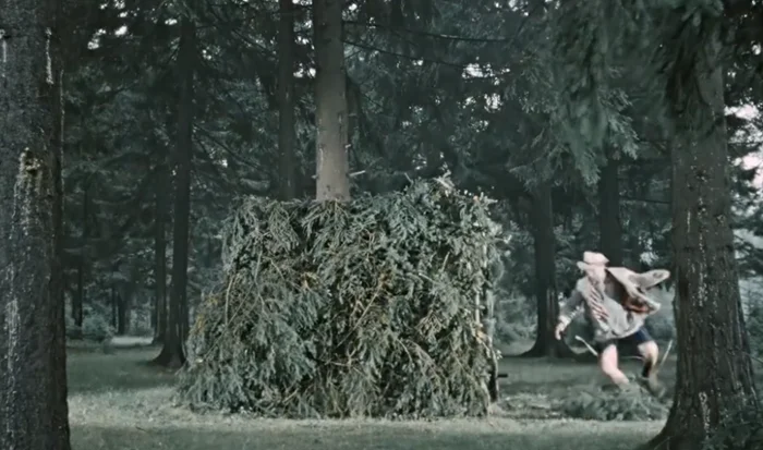 Дело в том, что худсовет посчитал, что медведь получился слишком ненатуральным. Да и сама сцена по мнению чиновников была весьма странной, ведь она заключалась в том, что Бывалый пробегает через шалаш, а затем выбегает оттуда без штанов. И уже в следующей сцене мы должны были увидеть того самого медведя в штанах.