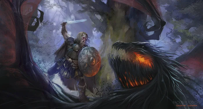 Там он и обнаруживает мать Гренделя, где после долгой и утомительной битвы (возможно с тентаклями) убивает её. За это он получает вечный почет, славу, ещё медовухи, женщин, ну и все - с развлечениями в те годы было не так чтобы разнообразно. Так он и жил много лет, сам в свою очередь став конунгом на родине, пока вдруг в его владениях не объявился дракон.