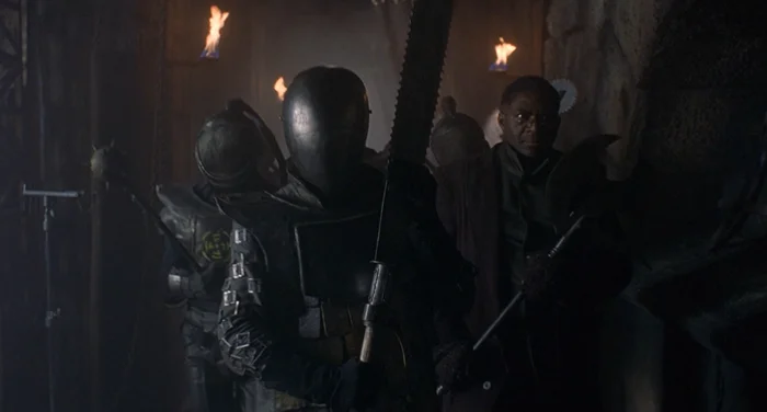 Вооружены люди при этом какими то пиломечами, циркулярными секирами, огнеметными копьями и бог знаем чем ещё, а конунг носит буквально киберпанковую металлическую сферу с полным обзором. При этом замок стоит на месторождении газа - вместо факелов форсунки, а погибших сжигают в кремационной печи ,предварительно упаковав в полиэтилетновые мешки.