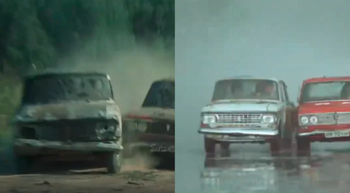 13. Когда герои гонятся за Ольгой, их машина сильно испачкана. На "Москвиче" было много повреждений, включая разбитую фару. Но когда они проезжают через струи воды от поливочных машин, фара волшебным образом восстанавливается.
