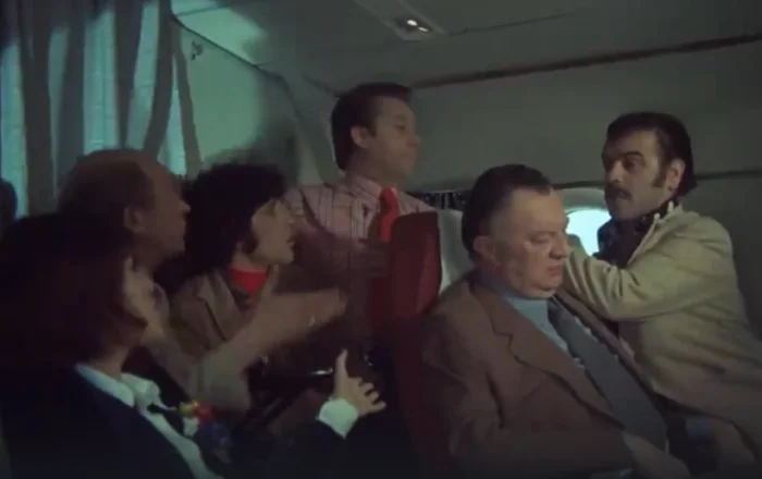 4. Самолет с героями садится на автостраду, и мы видим табличку, указывающую, что до Москвы 140 километров. Но вдруг на трапе появляется Андрей Миронов, за которым виден аэропорт "Шереметьево".