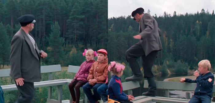 2. После этой сцены начинается погоня за дядей Митей, и в итоге женщины вместе с дядей Митей оказываются на танцах. Затем он совершает прыжок вниз. В этот момент на лавочке никого нет, зато на соседней сидят дети.