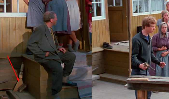 7. Когда Василий возвращается домой, у крыльца можно увидеть веник и совок. Но как только Лёнька хватает топор, и кадр снова переключается на Василия, веник уже исчез.
