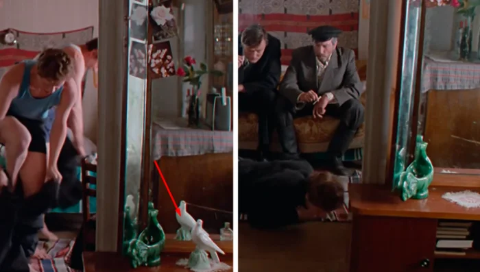 9. В сцене, где Василий и дядя Митя учат Лёньку армейским премудростям, на тумбочке стоит статуэтка голубя. Но в следующем кадре статуэтка исчезает.