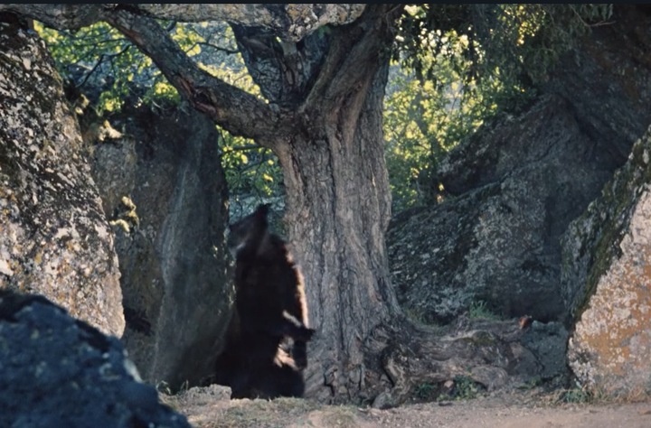 7. Многие заметили, что у медведя в одной из сцен был намордник. Однако на дереве также можно увидеть постороннего мужчину — дрессировщика, который подкидывал медведю лакомства.