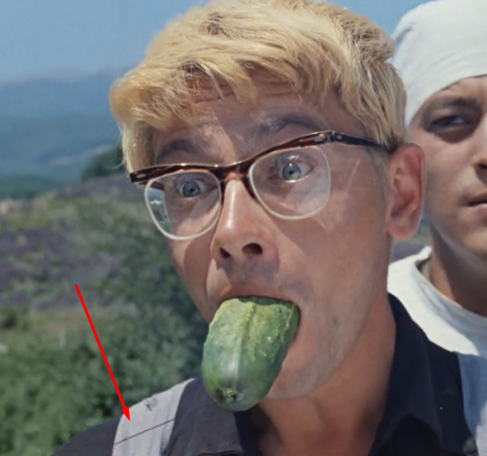6. Когда Балбес попадает Шурику огурцом в рот, видно, что из овоща торчит нитка. Это не киноляп, а просто сцена была снята в обратном порядке: сначала Шурику положили огурец, а потом выдернули его с помощью нитки.