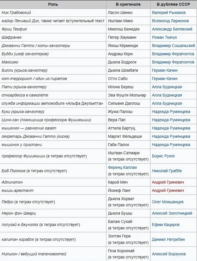 Полный список актёров, озвучивавших роли, я приведу из Википедии. Судя по всему, бюджета на озвучку было не так много, поэтому один актёр озвучивал несколько ролей. Возможно, просто решили, что не стоит тратиться на актёра на мелкую роль. В оригинале это были актёры, весьма известные в Венгрии, и совершенно неизвестные в других странах.