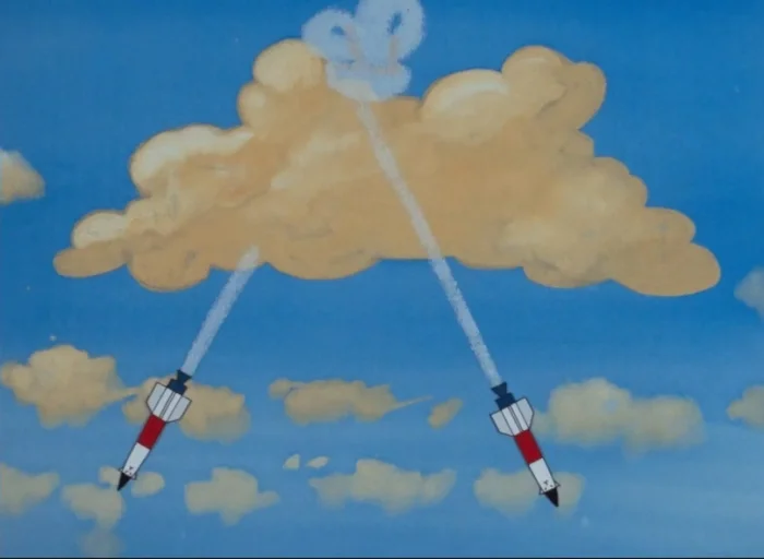 Хотя, конечно, ничто не сравнится с ракетами, которые запутались в своих же следах. Потом это облако начинает дождить прямо над Грабовским, который спрыгнул с самолёта, и он раскрывает парашют только для того, чтобы его подружка не промокла.