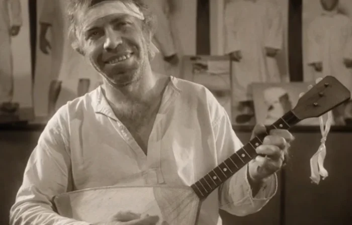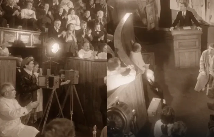 8. Давайте внимательно посмотрим на сцену. Обратите внимание на оператора, который снимает Шарикова, крутя ручку камеры. Он есть в кадре, но при смене кадра он внезапно исчезает.