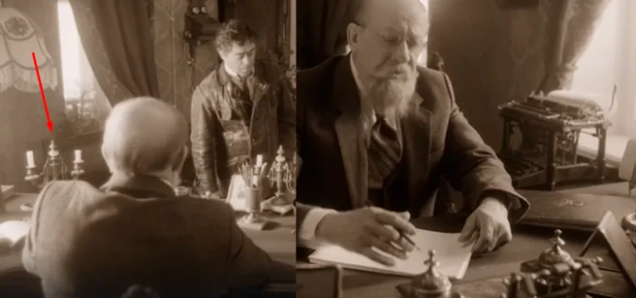 6. В одной из сцен (во время разговора профессора со Швондером) канделябр, который находился рядом с профессором, вдруг исчезает, хотя его никто не трогал.