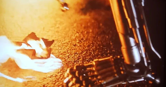 Несмотря на то, что Т-800 для своего времени был практически идеальным, у него был ряд недостатков, в том числе его внешняя оболочка, которая точно не была устойчива к огню. В одной из сцен терминатор пробегает через огонь и в следующем кадре видно, что у него пропали брови и ресницы, волосы на голове опалены, а кожа приобрела резиновый вид. Интересен и закулисный факт из этой сцены. Как только Т-800 пробегает, часть его куртки дымится. Это не графика, а самый настоящий практический эффект, достигнутый совсем не безопасным способом. По словам Арнольда Шварценеггера, Джеймс Кэмерон вылил на его куртку кислоту, чтобы добиться эффекта дыма и, как признался Шварц, это было весьма неприятное занятие.