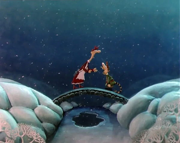 Финал «Падал прошлогодний снег» — неожиданно грустный. Мужичок садится на мостик, достаёт флейту, и звучит щемящая мелодия.