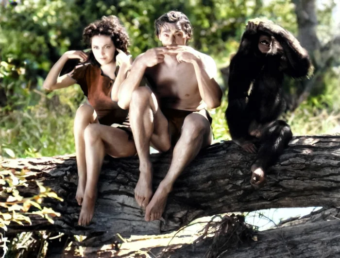 Ничего не вижу, ничего не слышу, ничего никому не скажу. Тарзан, Джейн, шимпанзе Чита. На съемках фильма: «Тарзан и его подруга». 1934 год.