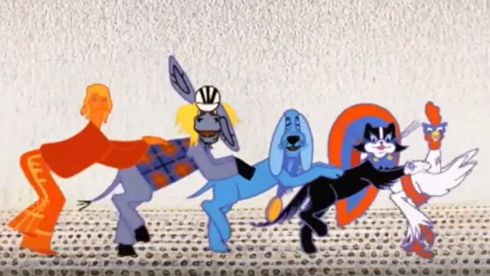 И поскольку на конец 60-х пришелся расцвет движения хиппи и рок-музыки на Западе, а история была как раз про европейский квартет, вся мульт-команда предстала в нетипичном и очень привлекательном для советской молодежи образе. Ультракороткое облегающее платье Принцессы, брюки-клеш и батник с вырезом Трубадура, пышная прическа и джинсы Осла, кожаные сапоги и очки-стекляшки Кота, цветастая рубашка и рок-гитара Пса — все это в одночасье переквалифицировало «Бременских музыкантов» из детского мультика в молодежный.